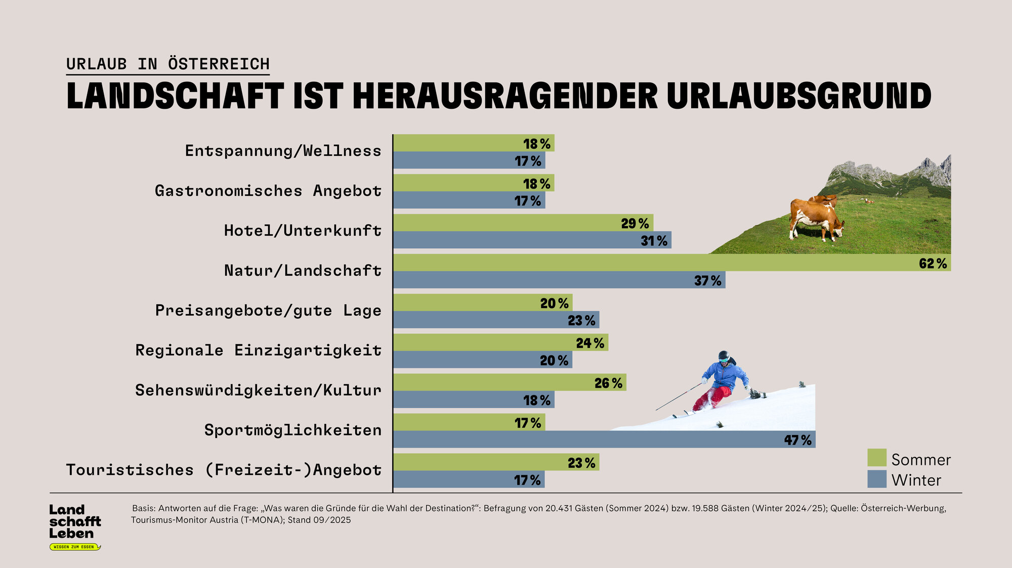 Hannes Royer: Wo Almflächen verschwinden und unsere Kulturlandschaft verbuscht, wird auch der Tourismus keine Zukunft mehr haben. Denn der Hauptgrund für Urlaub in Österreich ist die Landschaft. Vor allem unsere Almen ziehen jedes Jahr zahlreiche Touristinnen und Touristen an, sowohl aus dem Ausland als auch aus Österreich selbst. Man kann also sagen, dass die Almen das Juwel des österreichischen Tourismus sind. Sie spielen nicht nur eine unglaublich wichtige Rolle für den Sommer-, sondern auch für den Wintertourismus. Denn ohne die Bewirtschaftung dieser Flächen gäbe es auch keine Skipisten und damit fiele der Hauptgrund für Winterurlaub in Österreich weg.