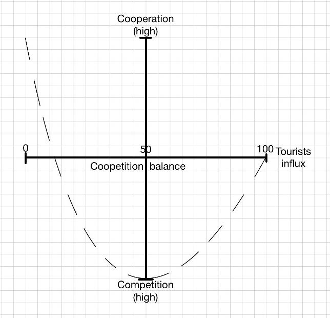 Diese Studie hat gezeigt, dass die Intensität der Zusammenarbeit und des Wettbewerbs je nach Touristenaufkommen variiert: In der Hochsaison sind beide Kräfte ausgeglichen, in der Nebensaison verschärft sich der Wettbewerb, und in Krisenzeiten (z. B. COVID-19) erreicht die Zusammenarbeit ihren Höhepunkt, da sich die Akteure zusammenschließen und ihre Kräfte bündeln, um dem Reiseziel zu helfen, sich von einer solchen Krise zu erholen. Ich habe diese Dynamik in einem Diagramm dargestellt (siehe unten), in dem man von rechts nach links sehen kann, wie sich die „Koopetition-Kurve”, also die Intensität der Zusammenarbeit und des Wettbewerbs, je nach Touristenaufkommen verändert.