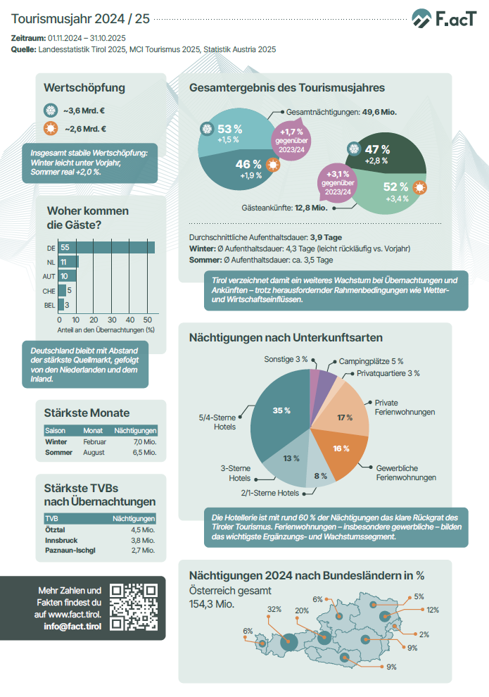Die Bilanz des Tourismusjahrs 2024/25 (von 1. November 2024 bis zum 31. Oktober 2025) fällt positiv aus: Die Nächtigungen sind um 1,7% auf 49,6 Millionen gewachsen, die Ankünfte um 3,1% auf 12,8 Millionen. Die durchschnittliche Aufenthaltsdauer der Tiroler Gäste ist gleich geblieben und betrug wie im Vorjahr 3,9 Tage.